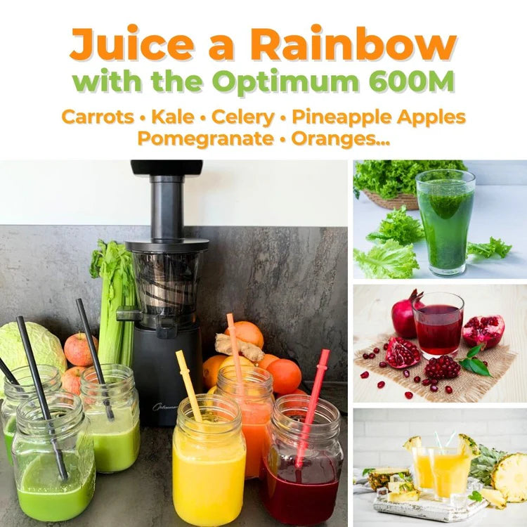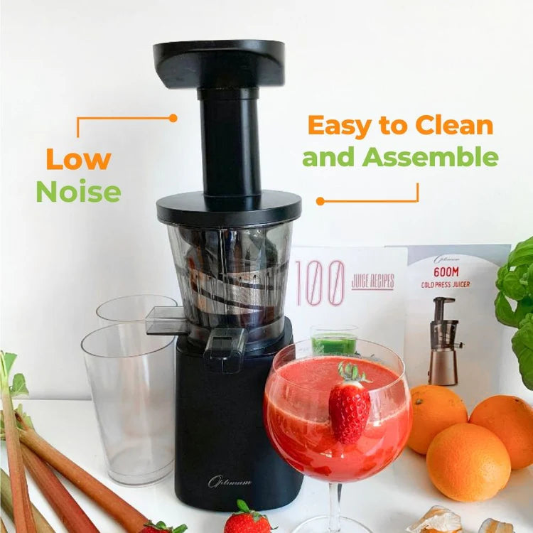 The Optimum 600M Slow Juicer is a cold press juicer that runs at a low 40-45 rpm (the slower the better), which means it can squeeze the maximum juice content out of your ingredients compared to traditional juicers.