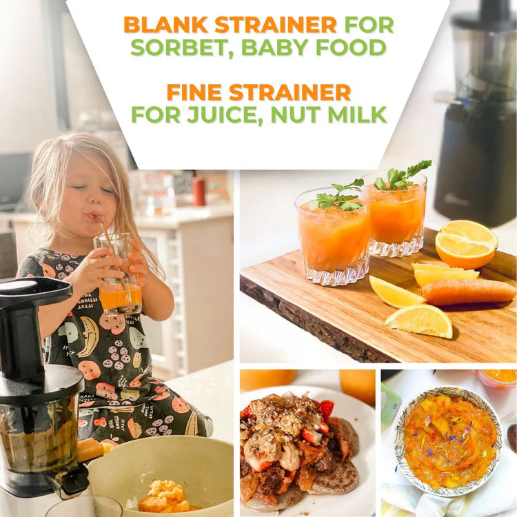 With the blank sieve attachment, you can make healthy frozen fruit sorbet. Simply add frozen chunks of banana, grapes, pineapple, mango or other fruit to your Optimum 600M cold press juicer for instant fruit sorbet that can be enjoyed anytime.