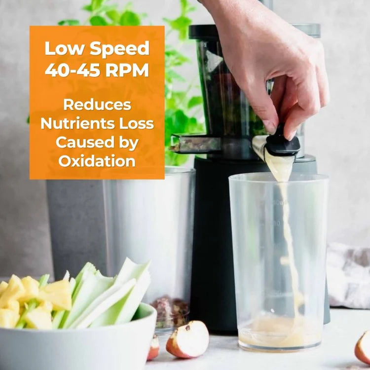 MAXIMIZE YOUR JUICE: Low speed of 40-45 rpm for ultimate nutrient retention + 10% - 20% more juice and less pulp than all other juicers